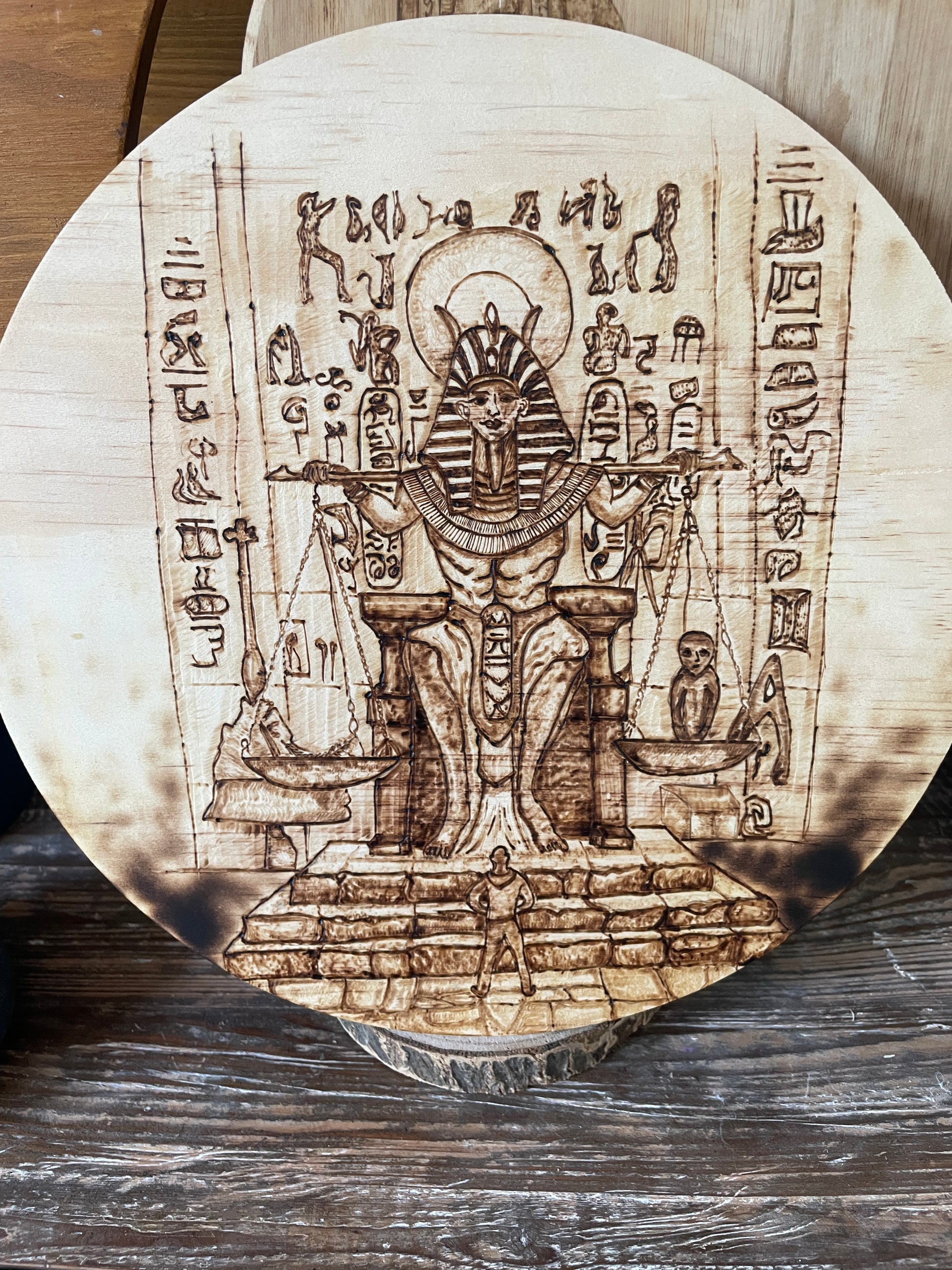Ce rondin de bois contreplaqué de 30 cm de diamètre est délicatement pyrogravé, illustrant le dieu Osiris en pleine scène de jugement de l’âme d’un mortel. La représentation met en avant la balance symbolique opposant l’âme à la plume, évoquant l’équilibre et la justice divine. Une pièce artistique raffinée qui invite à la réflexion sur la spiritualité et l’au-delà.